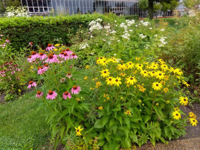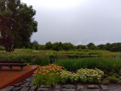 雨降りだったので「ガーデンセンター」方面まで行いませんでしたが、旭川駅前の「川のボーダー花壇」「疎林テラス」「水路メドウ」には色鮮やかな草花が咲き誇り、十分鑑賞することができました。