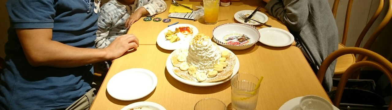 たまたま夕食時車で通りかかったら並んで居なかったのですんなり入れました。時間によるみたいですね。一人でカウンターでパンケーキ食べてる人が結構いました。あとは友人やカップルが多い感じですかね?パンケーキは前回ストロベリー子供が食べなかったのでバナナに挑戦。食べてくれて良かった。ガーリックシュリンプも美味しかったです。