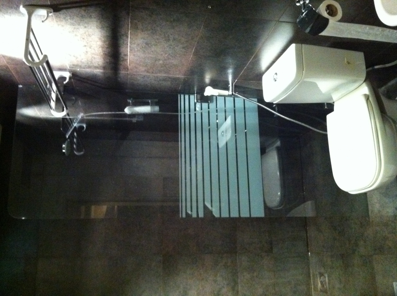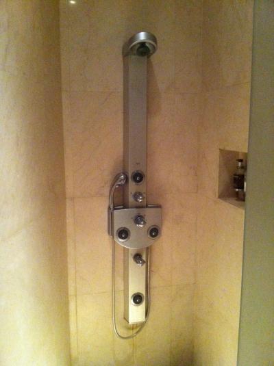 ドライヤーあり、アメニティなし、タオルあり、歯ブラシなし、シャンプーと石鹸は備え付けの別々、トイレなし、シンクなし、水勢温度は充分ただし不安定、ハンガーなし、スリッパなし- 旅行時期