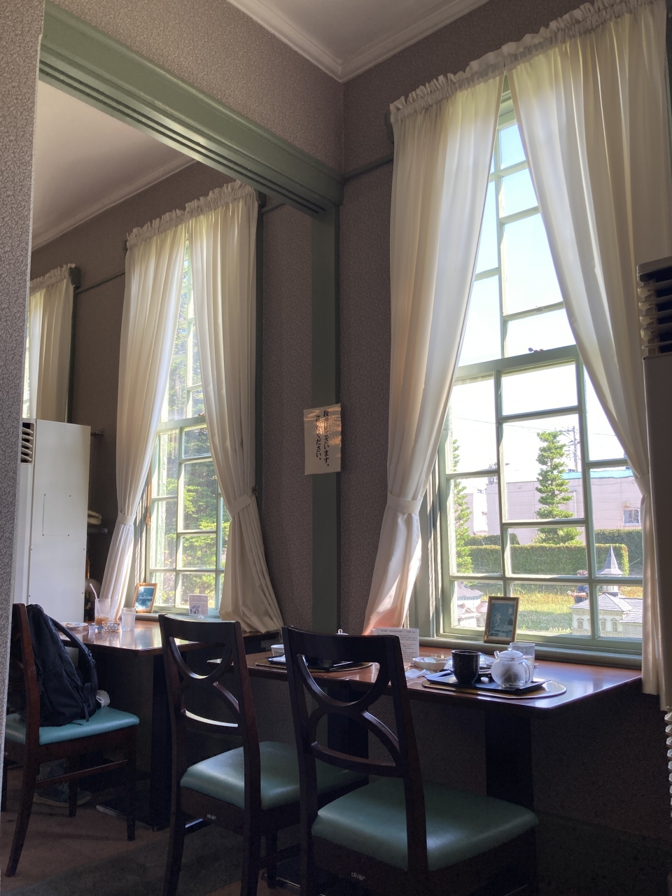 旧東奥義塾外人教師館に入ってその1階にあるカフェでした。この日は暑くて建物に避難したらちょうどいい休憩所になりました。アップルパイの街弘前ですが、ここでも売り物の一つのようでした。落ち着いたお店で、おばさまのゆったりとしたサーヴも明治のそれのようでした。
