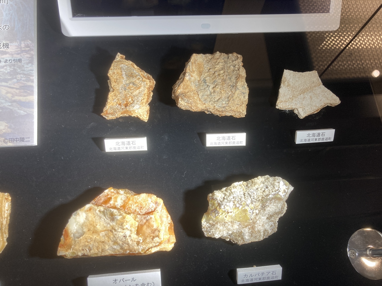 来札には見学する博物館ですが、今回は新たに発見された「北海道石」の展示が迫っていたので慌てて入館しました。正面玄関から中央のらせん状階段を3階まで上っていきアインシュタインドームを見て、鉱物岩石の展示コーナーへ。学名はhokkaidoiteで有機鉱物だそうです。