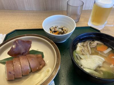 八戸駅構内といってもいい改札口フロアーにあります。昼時で席待ちの列に名前を書いて10分ほど待ちました。席に案内され早い料理は何と聞いて、注文タブレットではなく直接口頭で「いかめしせんぺい汁」注文。しばらく待たされて海鮮御膳が運ばれてきて、注文の行き違いがかわかり、結局店の方が口頭で聞いたのを忘れたようだ。すぐにに店の方がお詫びのドリンク表を持ってきた。むっとしたものの、小生ビールとリンゴジュースをるクエスト。注文品はなんとすぐに出てきて、おいしいいかめしとせんべい汁をいただきました。