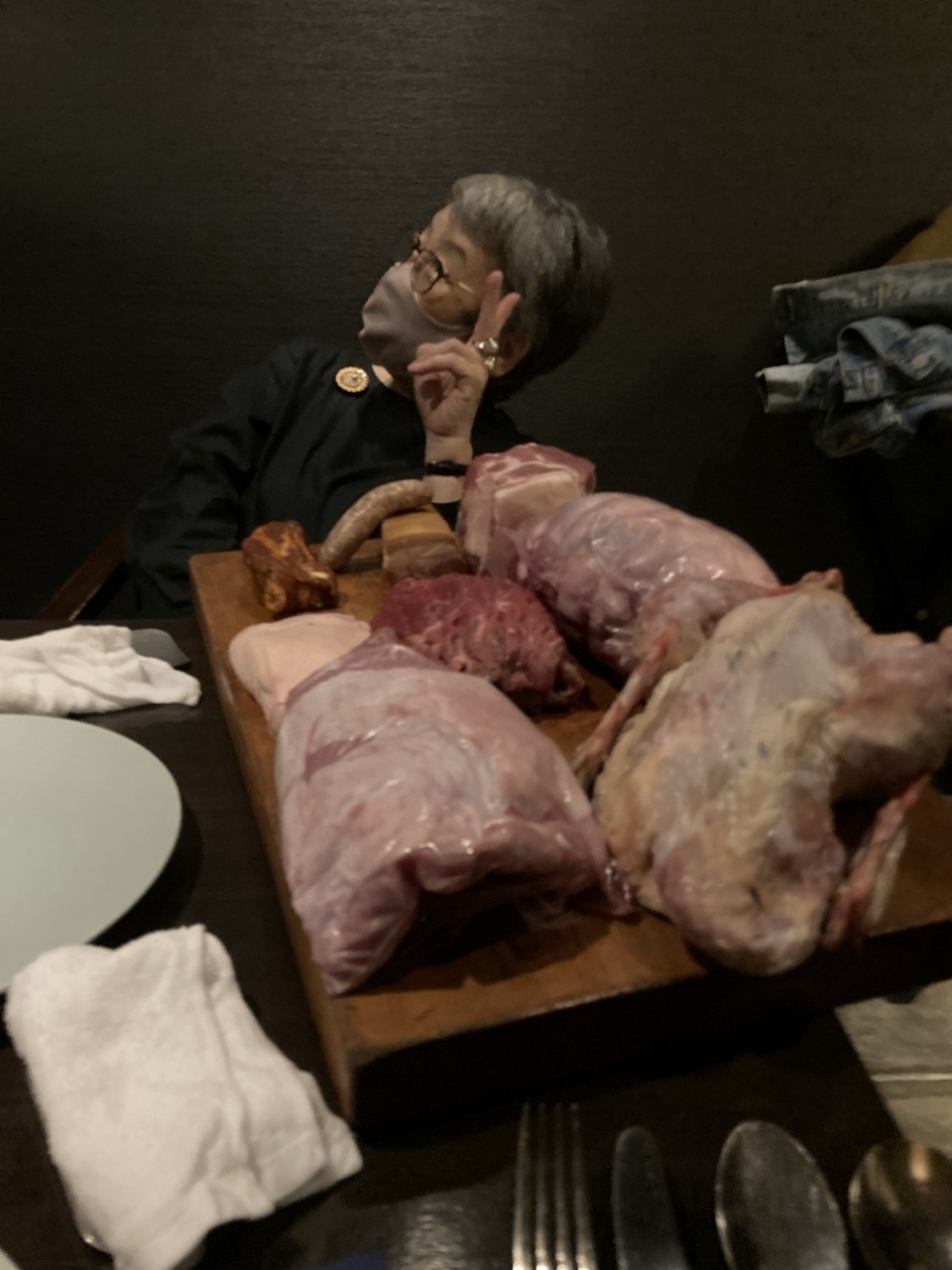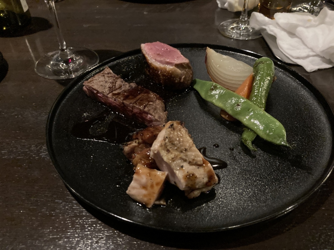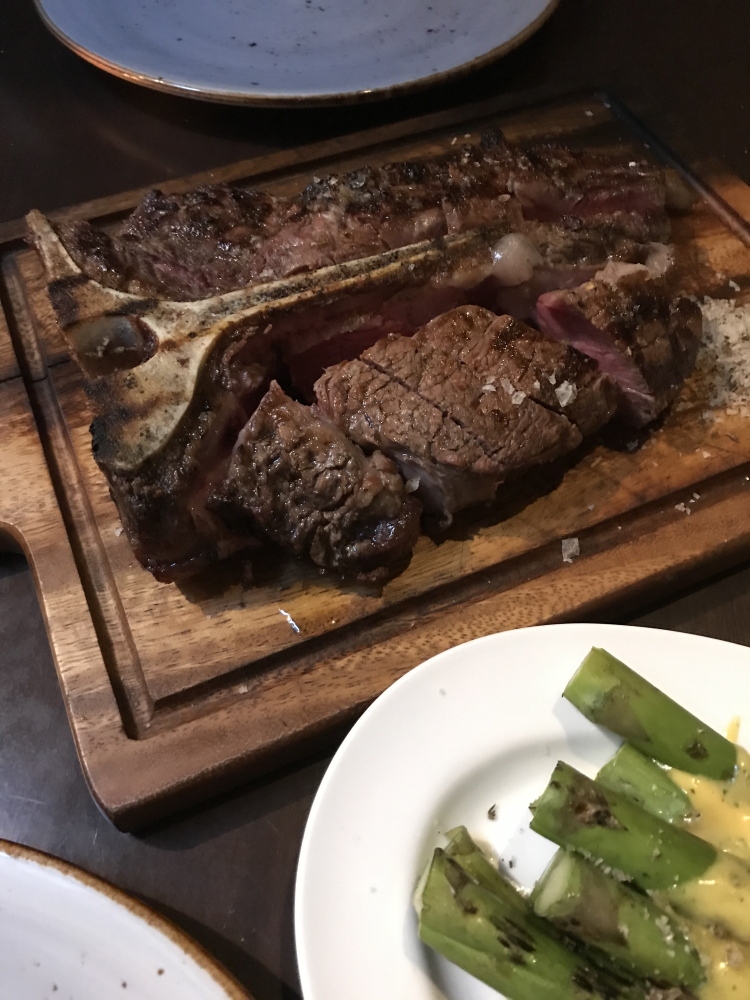 イタリアトスカーナの料理店という名の店です。最初にフォカッチャが出てくるところはイタリアである、と期待。アスパラガス炭火焼、トリュフリゾットなどいける。赤ワインがまわってきた頃、メインのフィレンツエのTボーンステーキ fiorentina 1.1kg が出てきた。料理もお値段も最高である。
