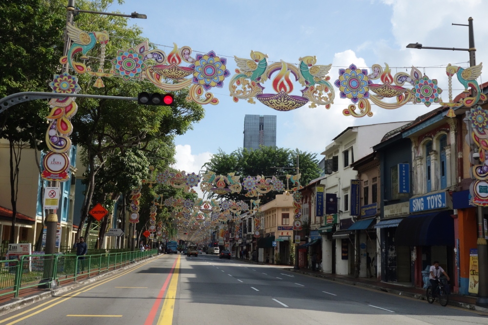 リトルインディアンの象徴のようなインド寺院である。入り口の脇のちょっとしたした広場で靴を脱ぎ中にはいることになっているようである。ヒンズー教でもないので、外から見学しました。外観、内観もカラフルで暑苦しいインドを想像させるようなお寺である。