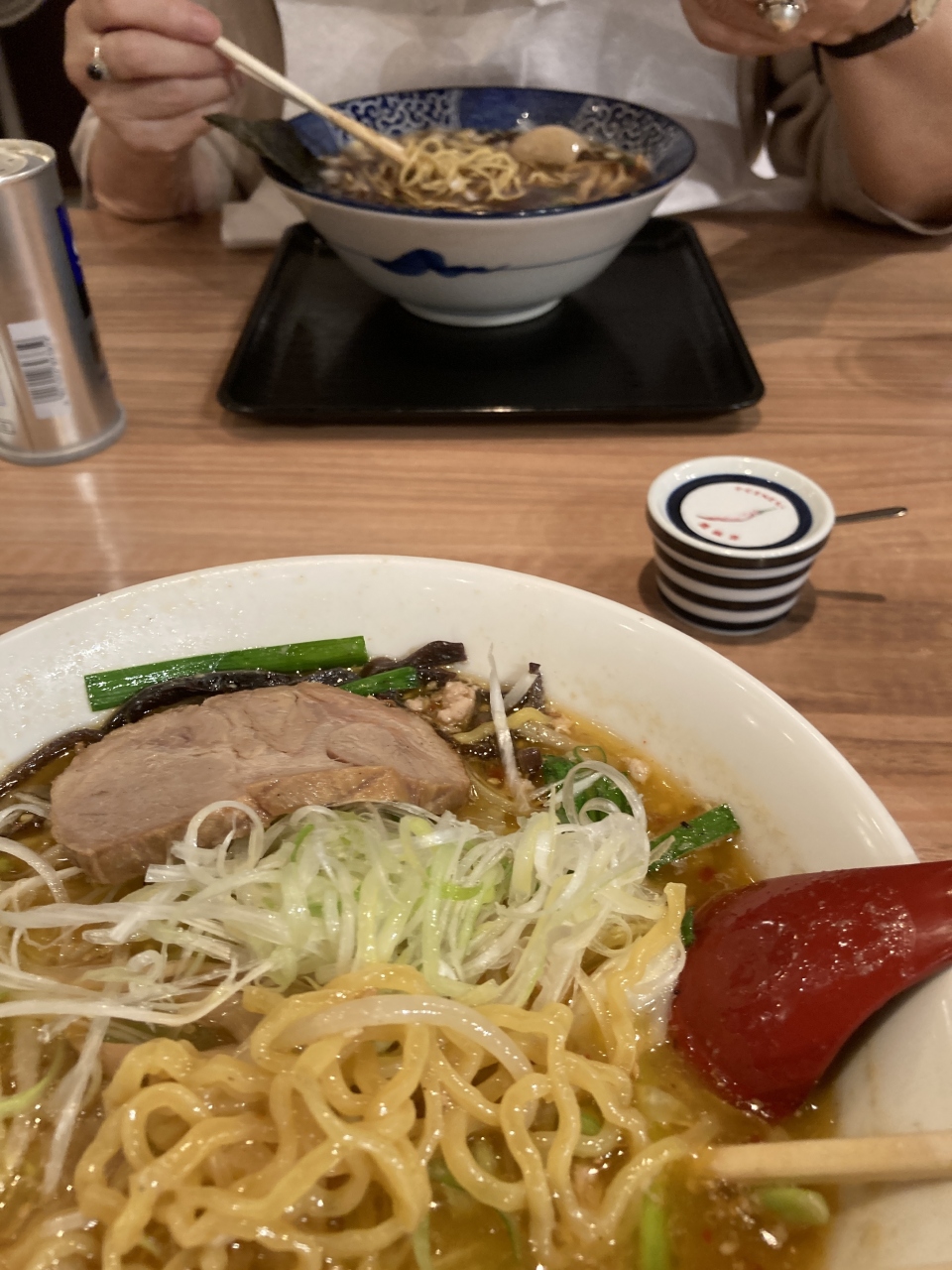 ラーメン道場は空港にくる度に食べていますが、今回はこの店。袋麺では随分と食していますがお店でいただくのは初めて。夫婦でコクのある味噌ラーメンと醤油ラーメンを注文。それぞれ特徴のあるスープと麺。とてもおいしかった。