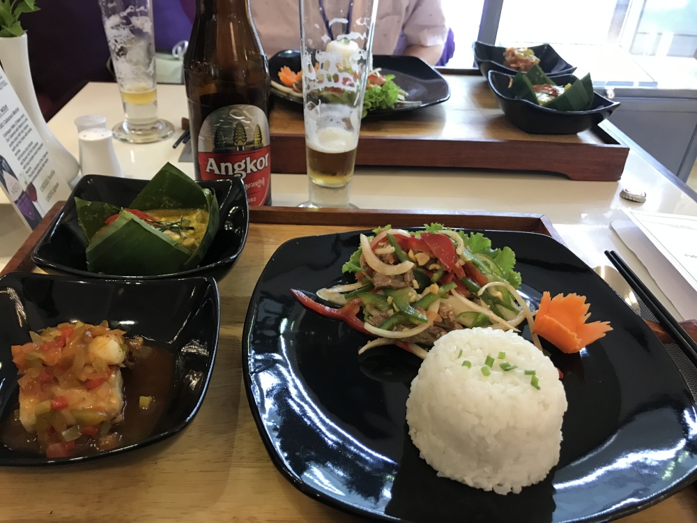 このホテルのレストランでランチを頂きました。まずはアンコールビール。セットメニューでスープ、サラダ魚、肉、三角盛りご飯がコンパクトにまとめられてるセット。これがカンボジア料理なんだね。味付けはひつ濃くなく良いお味。きれいなレストラン、ホテルでした。