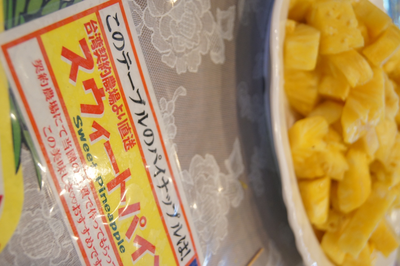 パイナップルの試食、食べ放題ではありますが台湾製です。- 旅行時期