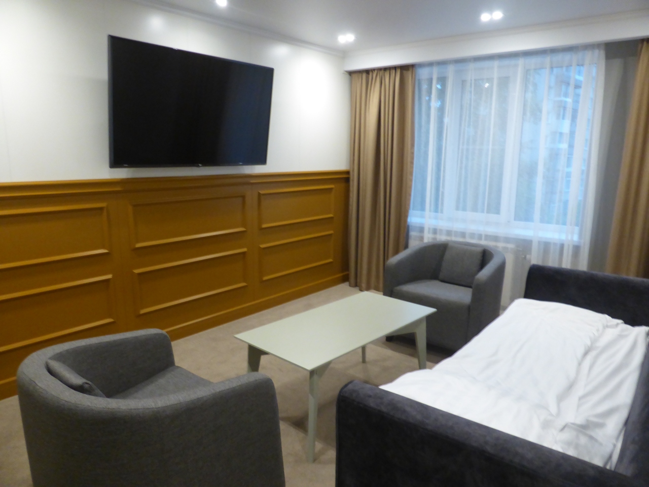 旧ソ連風の雰囲気は無く、ブティックホテルというだけあってモダンな雰囲気のホテルです。ダブル+ソファベッドの部屋でしたが、ソファベッドというか、ただのソファに布団が載っているような感じだったので、大人が寝るには狭すぎると思います。