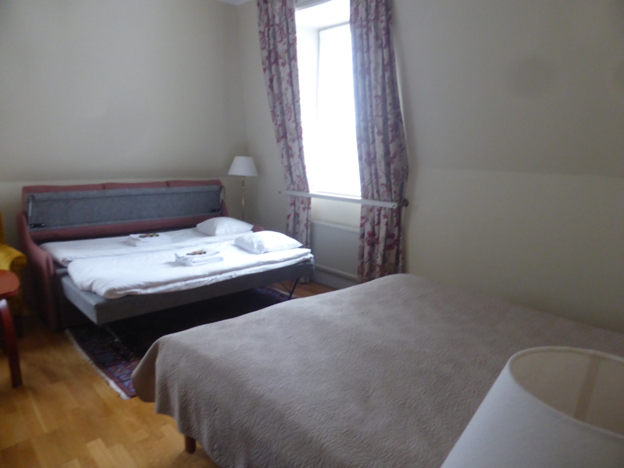 ストックホルム中央駅の目の前にあるクラシックなホテルです。ファミリールームに宿泊しましたが、シングル2つ+ソファベッドでした。その他にシングルソファ二脚とテーブルもありました。シャワールームはガラス戸が一部しか無く、床が水浸しになりました。水圧も弱めでした。