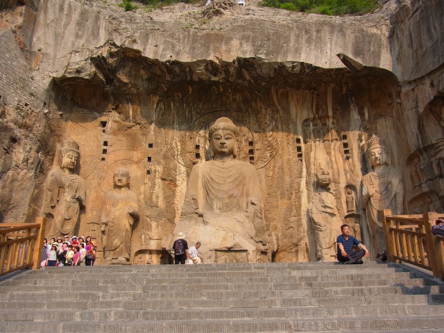 洛陽市内から路線バスで約45分で着きます。運賃1.5元、入場料120元でした。バスを下りてからしばらく土産物屋などが並ぶ道を歩き、チケット売り場でチケットを購入後、入場ゲートである龍門へ行ってください。チケット売り場を見落として龍門まで行ってしまった場合、チケット売り場まで戻されている人がいました(けっこうな距離)。石窟は川沿いにあり、階段を上ると石仏が間近で見れるようになっています。奥まで行くと橋を渡って対岸へ行けます。対岸からの眺めも素晴らしいです。