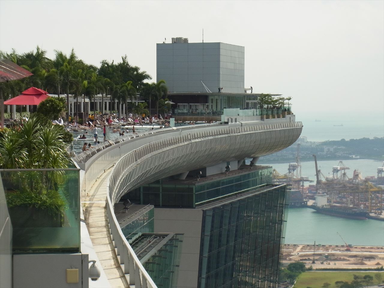 話題のスポット、マリーナ・ベイ・サンズですが、宿泊しなくても上に上がることができます。料金は20シンガポールドルでクレジットカード可です。上からはマーライオンやガーデンズ・バイ・ザ・ベイ、そして宿泊客しか入れないプールもちらっと見ることができます。