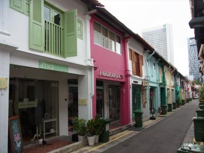 アラブストリートといえば、スルタンモスクの前の道には御土産屋などが並んで賑やかですが、一本脇道(駅寄り)に入ると、カラフルでおしゃれな街並みが広がっています。朝だったのでお店は閉まっていましたが、建物を眺めるだけでも楽しめます。