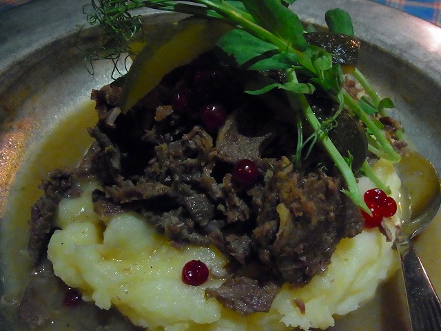 せっかくフィンランドに来たので、トナカイの煮込み20.20ユーロとカレリア風の煮込み16.60ユーロを注文。見た目どっちがどっちだかわかりませんでしたが、食べるとやはりトナカイは少々臭みが。どちらも似たような味付けで、クランベリーが載っていました。思ったよりあっさり味。他にはサーモンのスープが無かったのでマスのスープ9.80ユーロも注文しました。