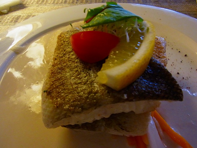 料理が出てきても暗すぎて何を食べているのかよくわかんない状態。フラッシュ撮影した写真を見てやっとどういうものを食べているのかわかったくらいです。壁に中世の絵が書いてあったりするんだけど、それも暗くてはっきり見えません。電気が無い時代はこんな暗い中食事していたんでしょうけど、ちょっと疲れる食事でした。雰囲気より食事を楽しみたい人は外の席をおすすめします。