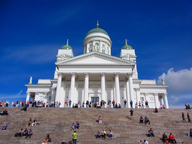ヘルシンキといえばこれ!というような教会です。真っ白な外観が、北欧の青い空に映えてとてもきれいでした。目の前の階段や広場にはたくさんの人がいました。入場料もかからず中に入れますが、休日は結婚式で入れない時間帯もあるようです。入口に看板が出ていました。