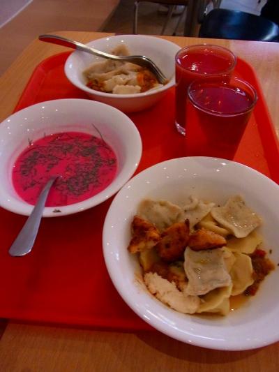 ペレメニのセルフ式レストランです。お盆を持って列に並び、食べたいものをよそって最後にレジで会計。ペレメニは数種類あって量り売りです。単価は一緒なので、別の種類のペレメニを同じお皿にいれて大丈夫です。スープ(1.10ラッツ)は一皿いくらなのでたくさん入れたもの勝ちですよ。