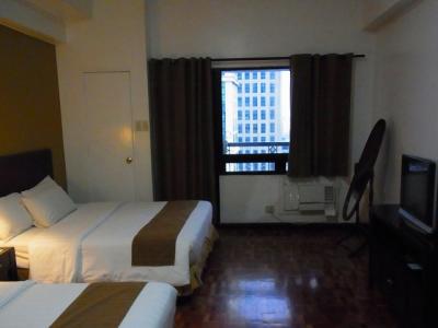 一室5千円ちょっとで宿泊。目の前がグリーンベルト5で、1Fにセブンイレブンが入っていて立地は抜群。ホテルは高層ビルで、コンドミニアム風。レストランが無いからか、朝食は時間を指定して部屋に持ってきてくれるとのことでしたが、6時に指定しても20分待ってても来ず、空港に向かう時間になったので食べられず終了。バスタオルが1枚異様に黒ずんでいて(臭くはないが)ちょっとひいた。