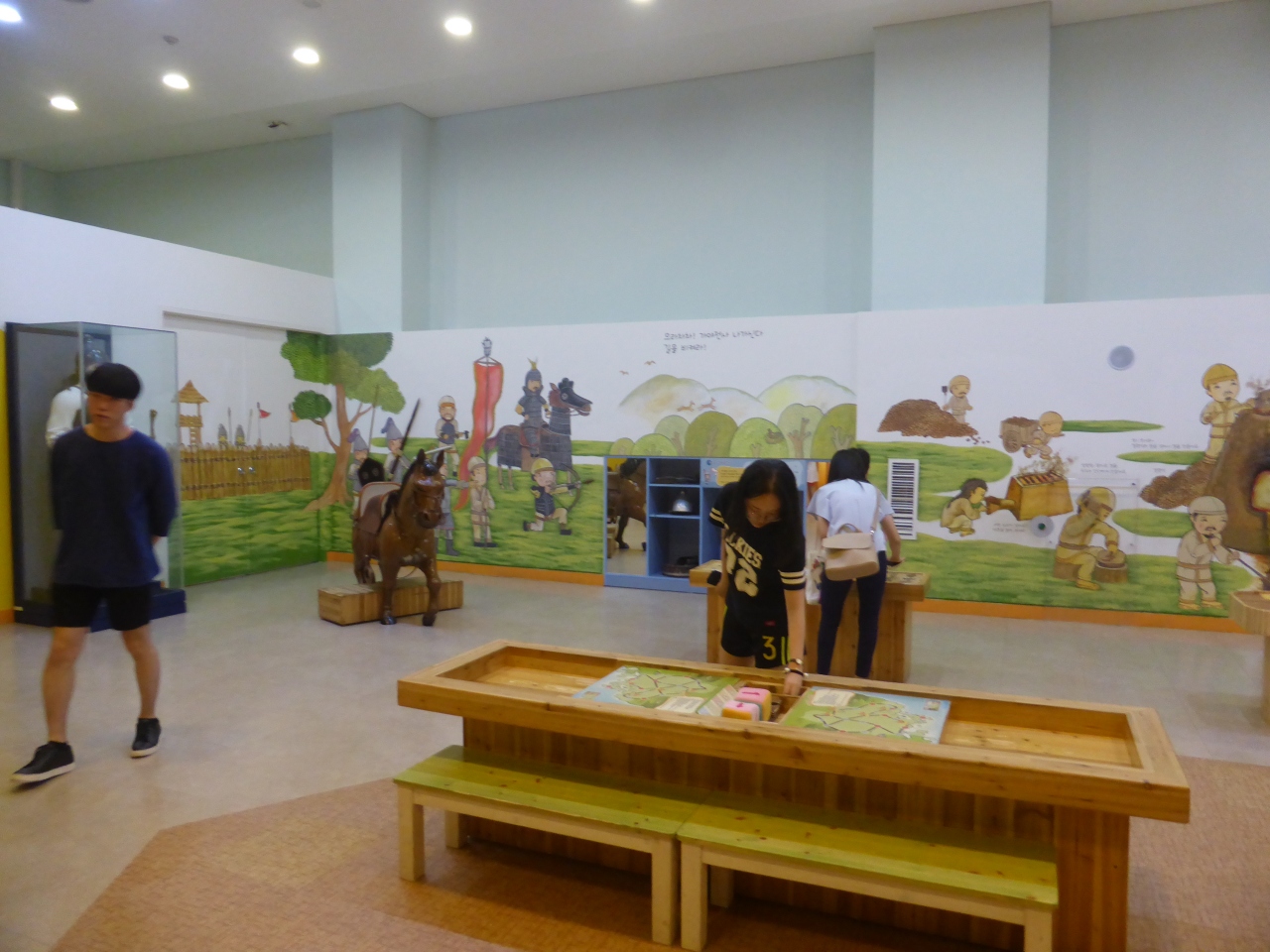 釜山中心部からは地下鉄で沙上(ササン)駅へ行き、その後金海軽電鉄に乗換え博物館駅で下車します。下車後すぐではありませんが、難しい道ではありません。博物館はメインの建物と特別展をやる建物があり、特別展の建物には子供が遊べるスペースがあります。といっても博物館に関する遊び場であり、昔の食器のままごとや土器のパズル、鎧を着て馬の模型に乗ったりすることもできます。
