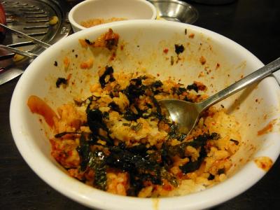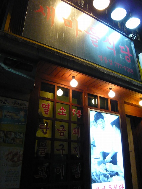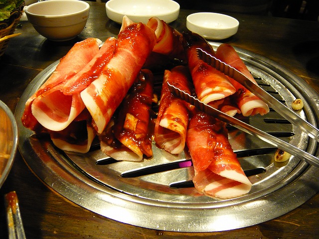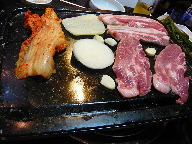 韓国通の人のお勧めで行ったお店。熱炭プルコギ・サムギョプサル・7分豚キムチを注文。熱炭プルコギは冷凍肉を薄く削ったものに辛いタレがかけてあります。サムギョプサルが好きなので頼んだけど、ここは首肉が人気のようで、みんな首肉を食べていました。失敗・・。サムギョプサルはイマイチでした。面白かったのが7分豚キムチ。小さい鍋に入った豚肉入りキムチチゲが出てきて、7分後にご飯にかけ、その上にノリを載せて食べるというものです。見栄えのいい料理ではありませんでしたが、おいしかったです。