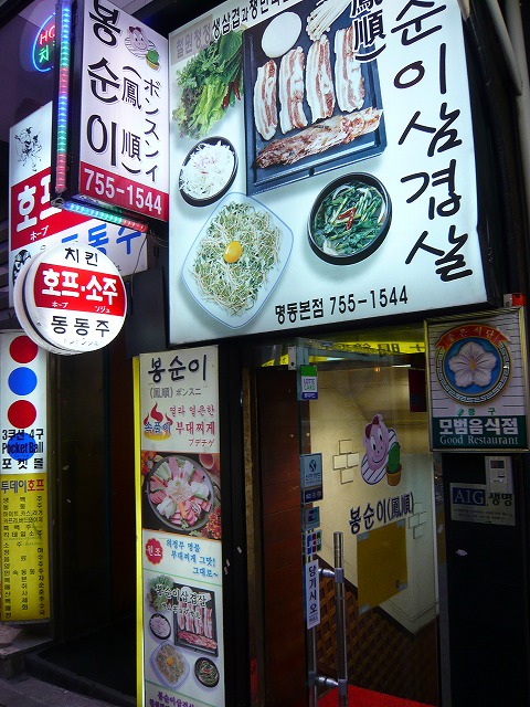 明洞でサムギョプサルが食べたい時はここに行きます。3度ほど行ってますが、客は日本人と韓国人が半々くらいの印象。スタッフは基本的に日本語は通じません。過去に二度チヂミを注文したのに食べ終わる頃になっても来ず、一度はお腹がいっぱいだったので言わず、二度目は言うとお詫びの言葉とともに持ってきてくれました。安くておいしいのはもちろんですが、私がこのお店を選ぶ理由はおかずの中の一品が大のお気に入りだからです。名前はわからないのですが、小さな鍋に入った、おから料理のようなものです。これもお代わりができるかわからないのですが、次回こそは聞いてみたいと思います(笑)別料金でも頼みたい一品です。
