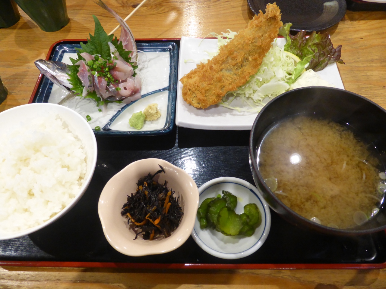 小田原漁港のレストランが集まっているエリアにあります。雨の連休中日の13時前に行きましたが、数組待っている程度でした。屋内の待合室があるので待つのもそれほど苦にはなりません。やはりアジを食べないと!と思い、アジフライとアジの刺身がついた定食¥1580を注文。つみれ汁もついていて、すべておいしかったです。地魚フライというものもありましたが、それにはアジは入っていないとのことでした。席の間隔が広めなので、小さい子連れでも入りずらくなかったです。子供用チェアもありました。