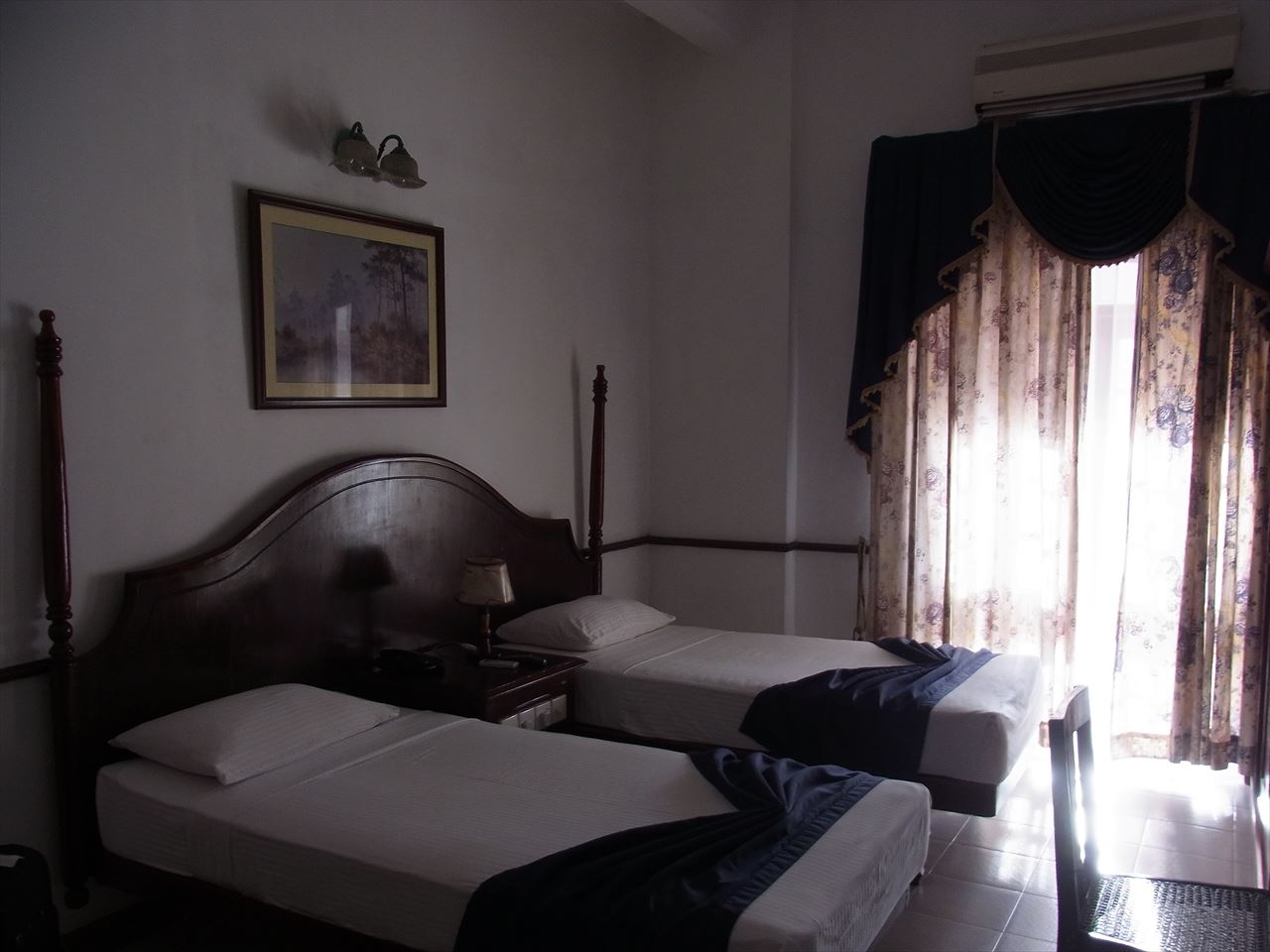 一泊一室8千円ほどで宿泊。仏歯寺の目の前にあり、立地は便利です。ホテルは古いですが、歴史のあるコロニアル建築で、格式の高い古さだったので○。部屋はシンプルで天井が高く、ヨーロッパのホテルっぽかったです。窓を開けると猿が入ってくるかもしれないので開けないでくださいと書いてありました。バスルームのガラス戸が壊れていて、バスタブ側から完全に閉められないのが不便でした。あと日本人団体客の利用が多かったです。