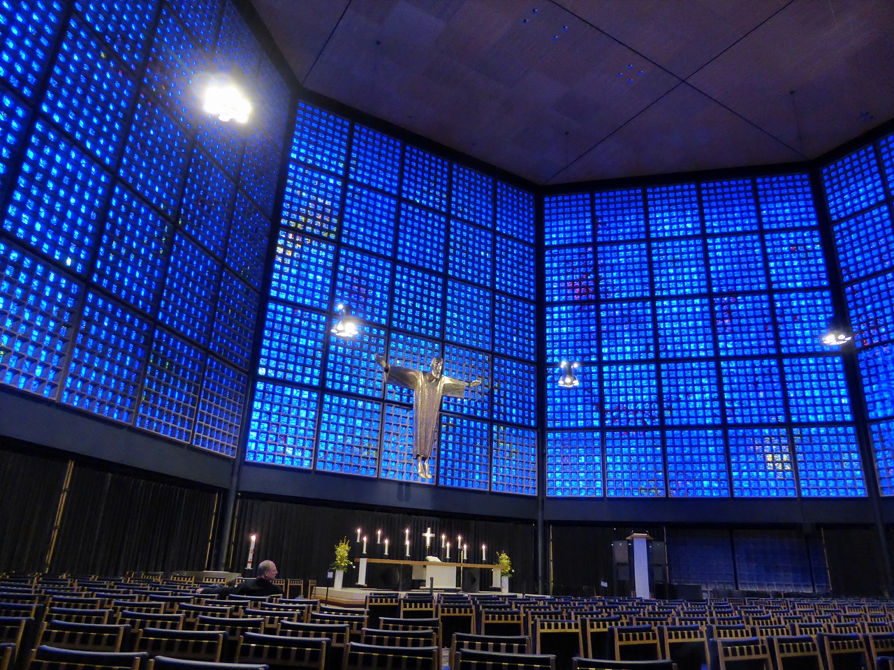 クーダムエリアにある教会です。戦時中に爆撃を受けて損傷した教会を見たかったのですが、補修工事中だそうで、外観を見ることができませんでした。中には入れるようですが、私が訪れた日はちょうど入れない日でした。隣に変わった外観の建物があるのですが、そこは新しい教会で中に入れます。壁一面の青いステンドグラスに圧倒されること間違いなしです。