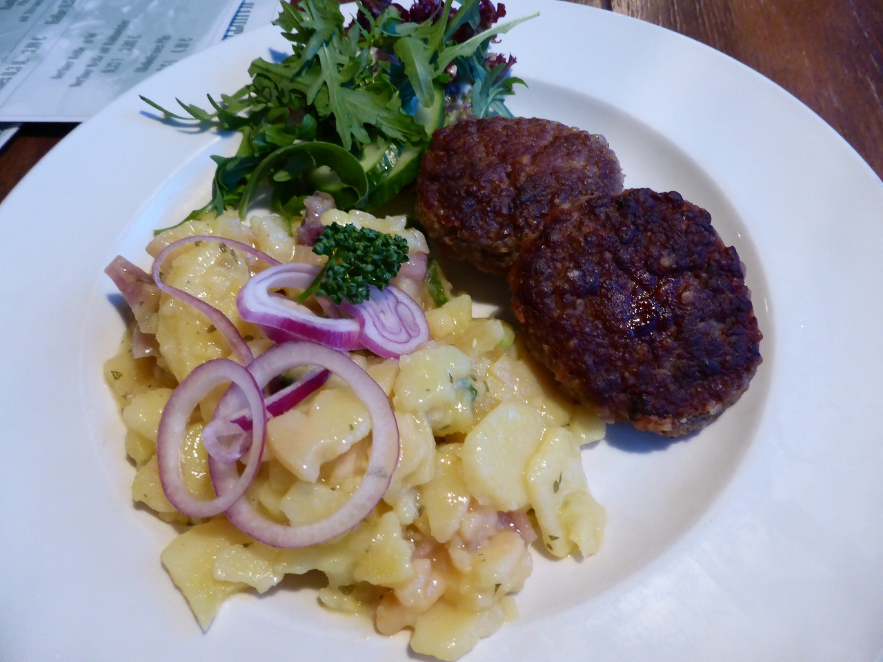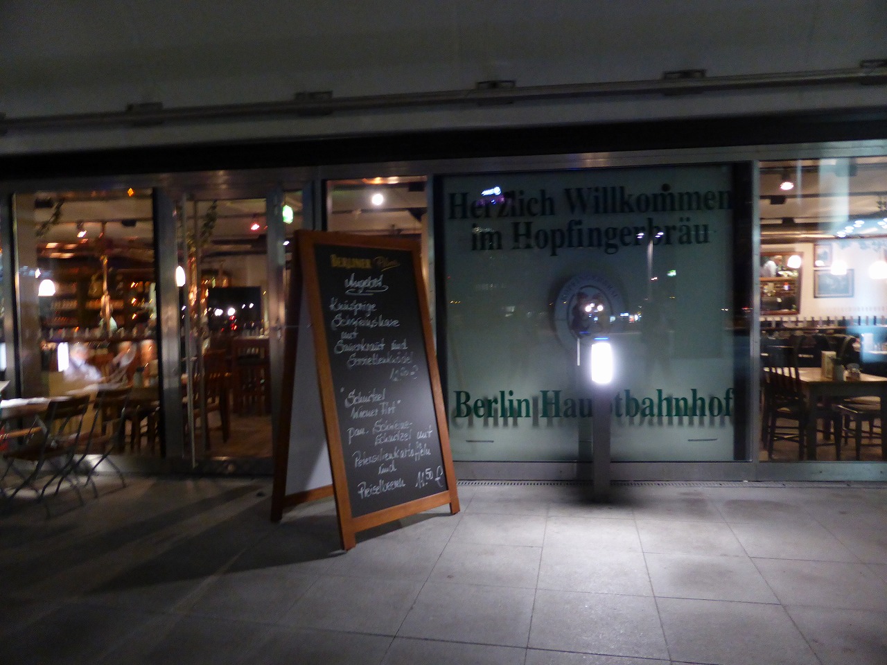 ベルリン中央駅の中にある(入口は駅の中ではなく、駅を裏口から出て右に曲がり、階段を上がったところ)、ドイツ料理のレストランです。ポツダム広場にあるリンデンブロイと同系列ですが、HPでメニューを見るとこちらのほうがちょっと安いようです。地元のビジネスマンが帰宅前にちょっと飲んでいくって感じの人が多かったです。メイン一皿10ユーロ前後です。