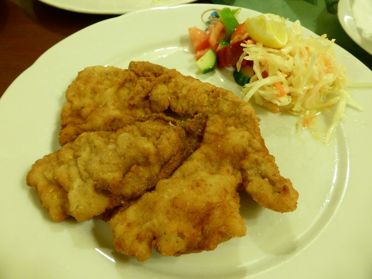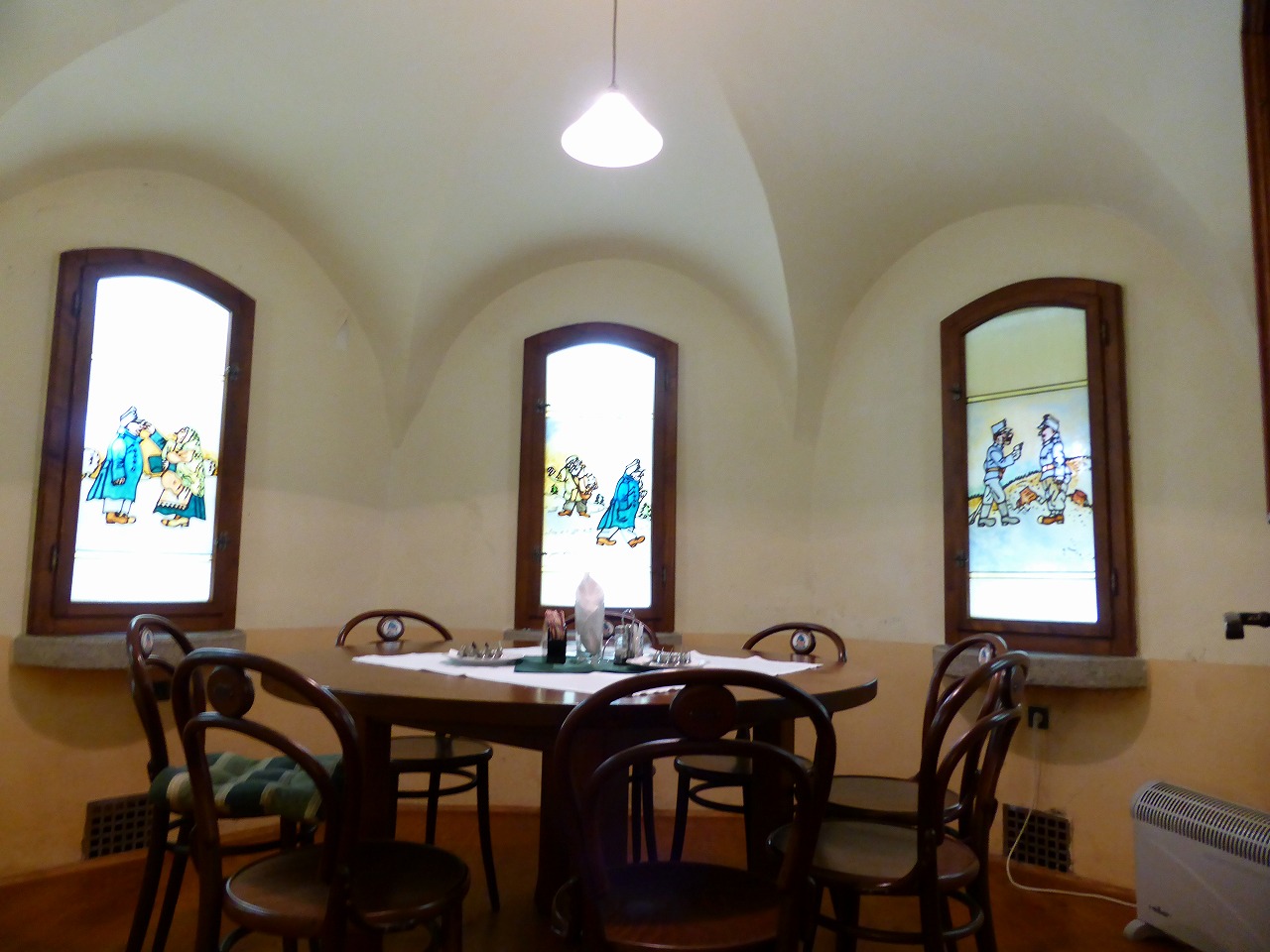 テルチ城のすぐ手前にあります。横に長い建物で、真ん中に厨房があって入口がその両側に分かれていました。チェコで有名な小説『善良な兵士シュヴァイク』のテーマレストランで、あちこちにキャラクターが。料理はプラハに比べると安いがボリュームは少な目でした。スープ32コルナ、ポークシュニッツェル98コルナ、クレープ55コルナなど。スタッフのお姉さんはとても感じがよく、英語も注文程度ならOKでした。