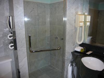 ホテル内外はあちこち改装中で、私の泊まった部屋は改装したてだったらしく、ペンキくさいぐらいでした。部屋の広さは普通で、液晶テレビ付き。バスルームは広いとは言い難いですね。