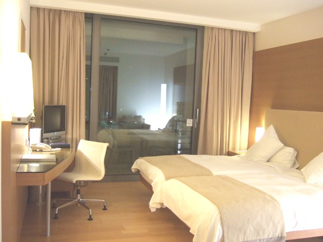 写真は5階のお部屋の様子です。お部屋は広々していて、ベッドも大きいし、インターネットの設備も整ってます。窓が広いので、とても開放的ですよ。