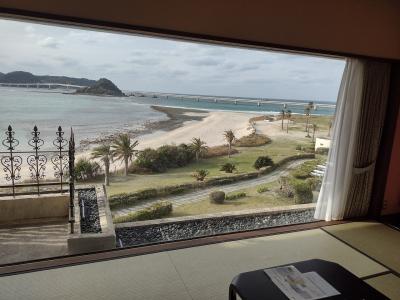 角島大橋を見渡せる高台に建つリゾートホテルですが、だいぶ古さは目立っています。