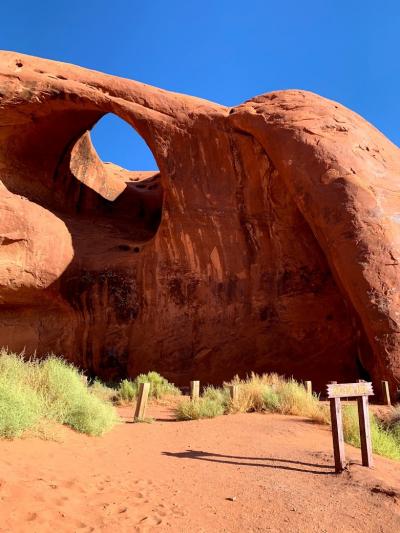 バレーツアーの先住民族ガイドありの人のみが入れる区域の最初に見れるアーチです。何千年、何億年の年月とともに風化してきたこのアーチ。あと何年見ることができるのだろうと感じます。アーチの下まで行くことができ、岩に触れることも可能です。