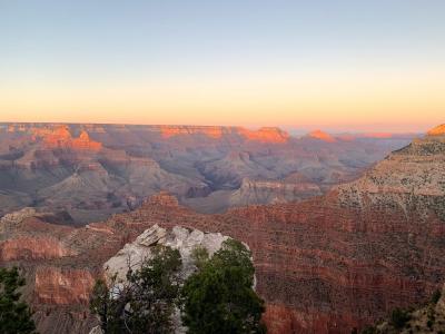 ビジターセンターから歩いてすぐのビューポイントであるマーサポイントはかなり観光客が多いです。シャトルバスもここから出ているので、便利な場所でもあります。かなり有名なビューポイントの1つです。夕日が少し終わったころに行ったので、上だけ赤く染まるグランドキャニオンが見れました。