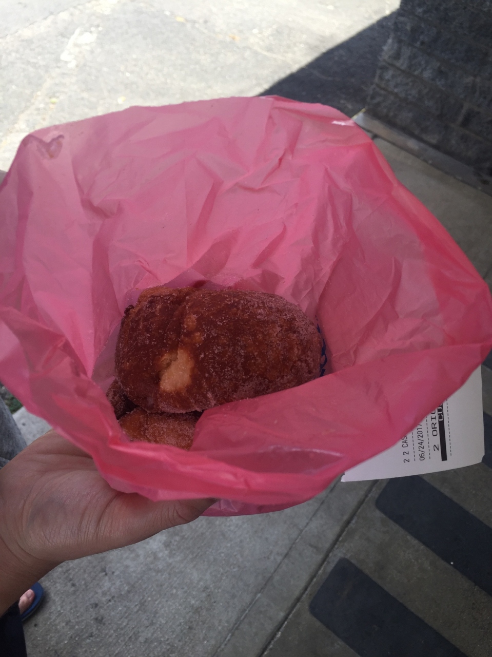 お味はふわっふわの生地に大量の砂糖がコーティング、カスタードを注文しましたがクリームがあっさりしてて美味しいー!