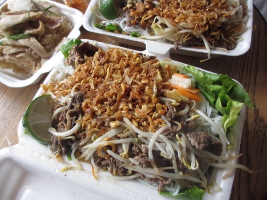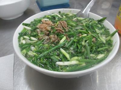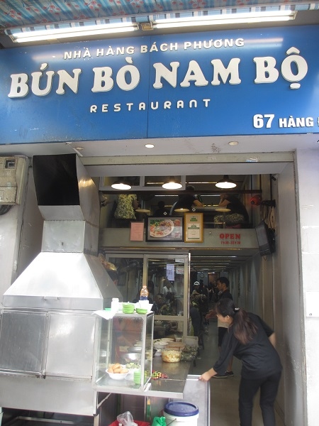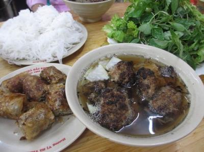 牛肉麺の専門店。炒めた牛肉・もやし・フライドオニオンを麺に乗せて、甘酸っぱいタレを絡ませていただく料理です。冷やし中華のベトナム版といった感じでしょうか。生温かい状態でいただきます。病みつきになるおいしさで、ハノイ旅のときは必ず立ち寄ります。ランチにオススメです。