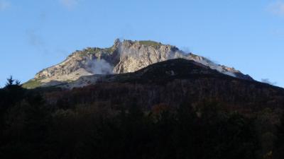 朝、暗いうちから露天風呂。なんと雪がちらちらした。夜明けの硫黄山が素晴...