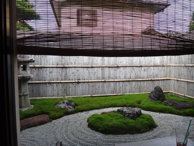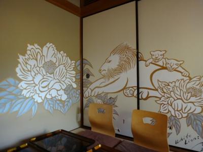 お庭がきれいなんですが、残念ながらお庭に面した席はいっぱいで、和室になってしまいましたが(畳敷きなので、靴を脱いで座布団に座る)、襖絵やお軸が青蓮院などでもおなじみのKi-Yan作でかっこよかった!