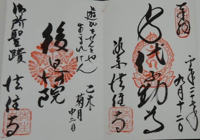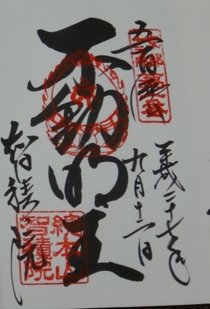 御朱印は4種類あるのですが、「後白河院」という御朱印をいただこうとしたところ、「一つだけの場合はご本尊です」ということでしたが、ご本尊の身代わり不動は義仲の放火の際に、後白河上皇の身代わりとなったいうことだったのでありがたく両方いただくことにしました(普段は一か所でいくつもいただかず、参拝するごとに一つとしているのですが…)。住職が書かれた見本は達筆すぎてなんと書いてあるかわからなかったのですが、寺庭婦人と思しき女性が授けてくださった流麗な御朱印のおかげで今回ようやく読み方がわかりました。