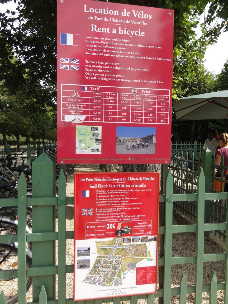 自転車が1時間6.5ユーロ、カートが1時間30ユーロでした。少し高いですが、グラントリアノン、プチトリアノンに行く方には、借りることをお勧めします。私たちは歩いて行きましたが、帰りはへろへろでした。- 旅行時期