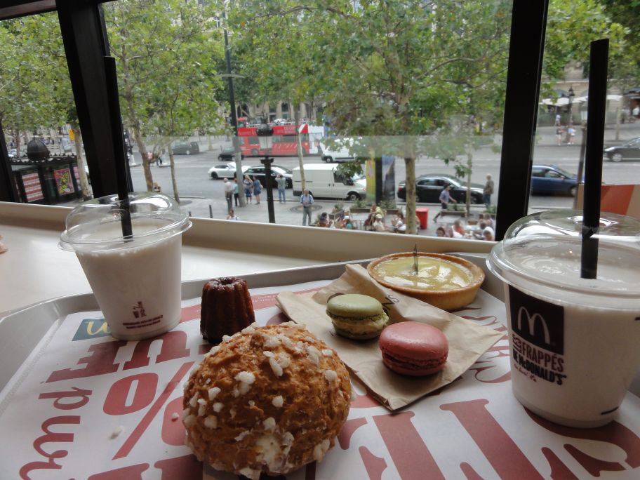 近くにマクドナルドがあり、シャンゼリゼを見下ろしながら飲食できます。また、1Fにトイレがあります。が、すごい混雑です。マクドナルドカフェも同居しており、マカロンが1ユーロ等、スイーツが充実してました。- 旅行時期
