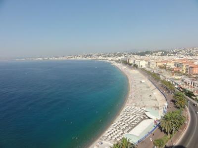 ニースの朝市を抜けて、登っていくと城跡に出ます。途中、いくつかの分かれ道がありますが、展望台に向かって登っていきます。途中、絵描きさんが自分の絵を販売していました。結構面白い絵を描いており、私たちも3枚買いました(1枚2ユーロ)。城跡まで登ると、ニース海岸の景色はすばらしく、絶景です。何枚も写真を撮りました。ただ、人がそんなに多くなく、写真を撮ってもらおうとすると、人が来るのを待つことも。城跡公園は、結構広く、芝生広場や子供の遊び場もあります。ニース市街と反対側の景色もきれいでした。