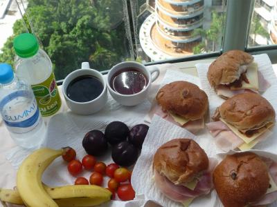 食事は、パン、ハム・チーズ、ヨーグルト、フルーツ、飲み物等のコールドビュッフェ。ほぼ毎日同じメニュー。