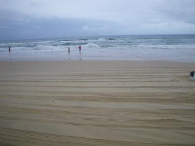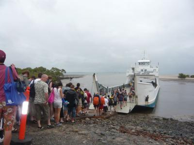 ハービーベイからフェリーでフレイザー島へ。ホテルで予約した申し込み券を、港でチケットに交換し、フェリーに乗り込みます。フェリーの中には、売店があり、パンやコーヒー、お菓子が買えます。フェリーはかなり込んでいて、椅子には座れず、デッキから海を見ていました。デッキには四輪駆動の車がぎっしり。(ハービーベイの街のレンタカー屋さんには、四輪駆動車がたくさん並んでいます。)