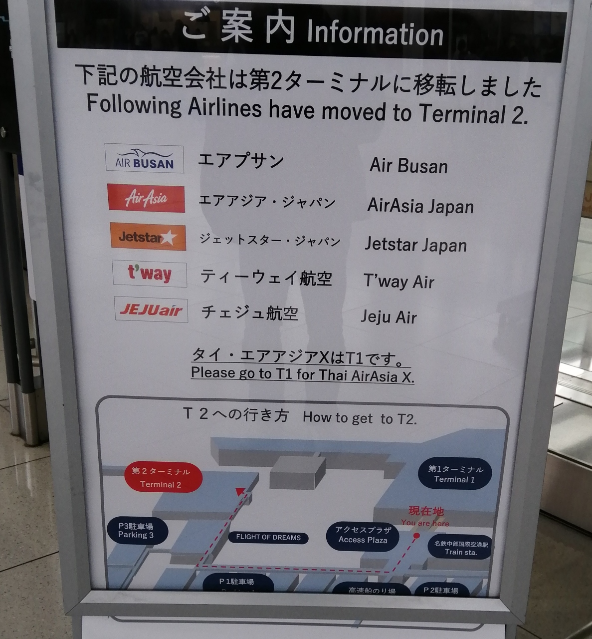 鉄道側から3Fの出発ロビーへ向かう連絡通路の入口にかんばんがありLCCは第2ターミナル(9/20オープン)との案内!!でしたが、今回は運良くドムアン乗り継ぎのためタイまではタイ・エアアジアXを利用するので今まで通りでした。10/17時点でエアプサン・エアアジアジャパン・ジェットスタージャパン・ティーウェイ航空・チェジュ航空の5社がT2とのことでした。