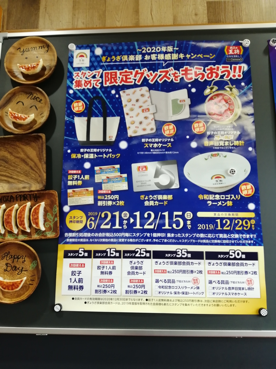 店内はカフェのような雰囲気??でメニューの食品サンプルが壁に沢山飾られています。2020年版のぎょうざ倶楽部お客様感謝キャンペーンが始まっているようでポスターが貼られていました。テイクアウトは20分程度で提供されましたよ。