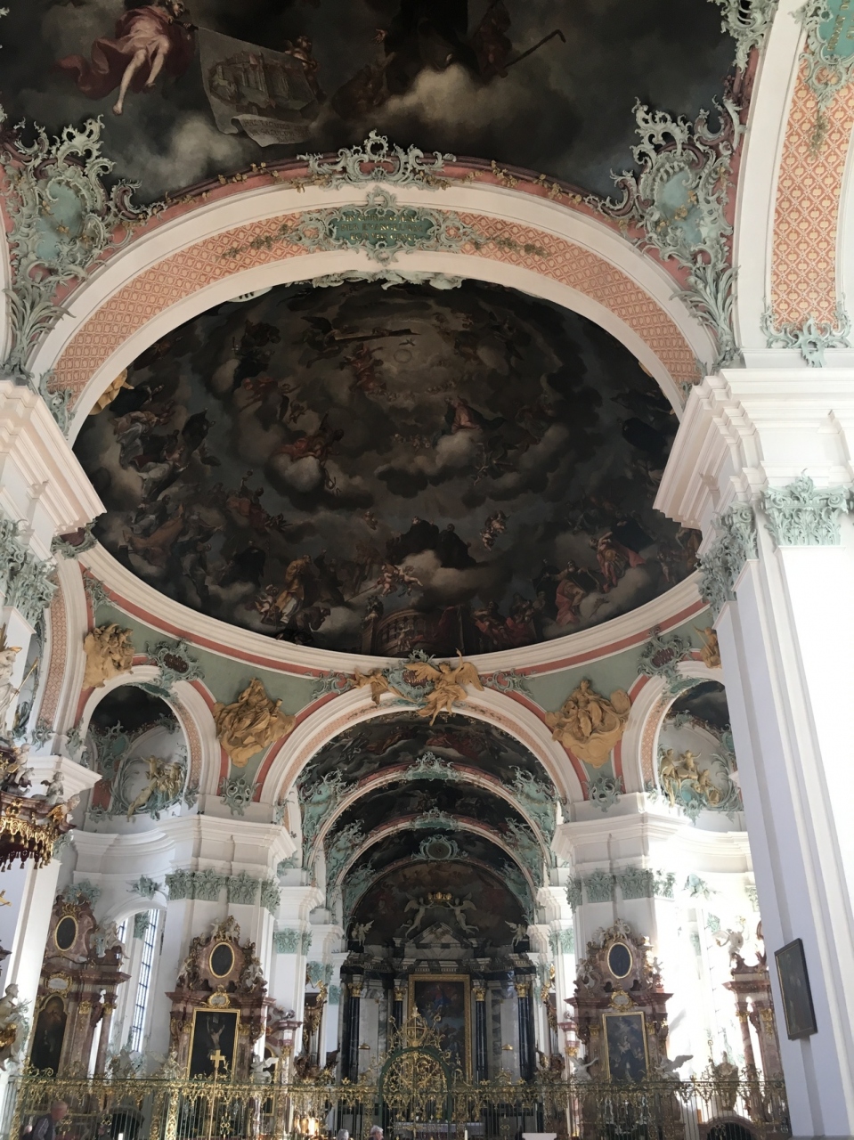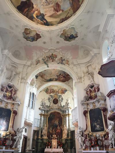 7時くらいから開いてるみたいでした。装飾と天井画がすごいので、ザンクトガレン修道院に来たらこちらも必見です。ザンクトガレン駅から歩いてきて、修道院に進む手前にあります。11:20くらいに入ると、少ししてパイプオルガンの演奏がありました。