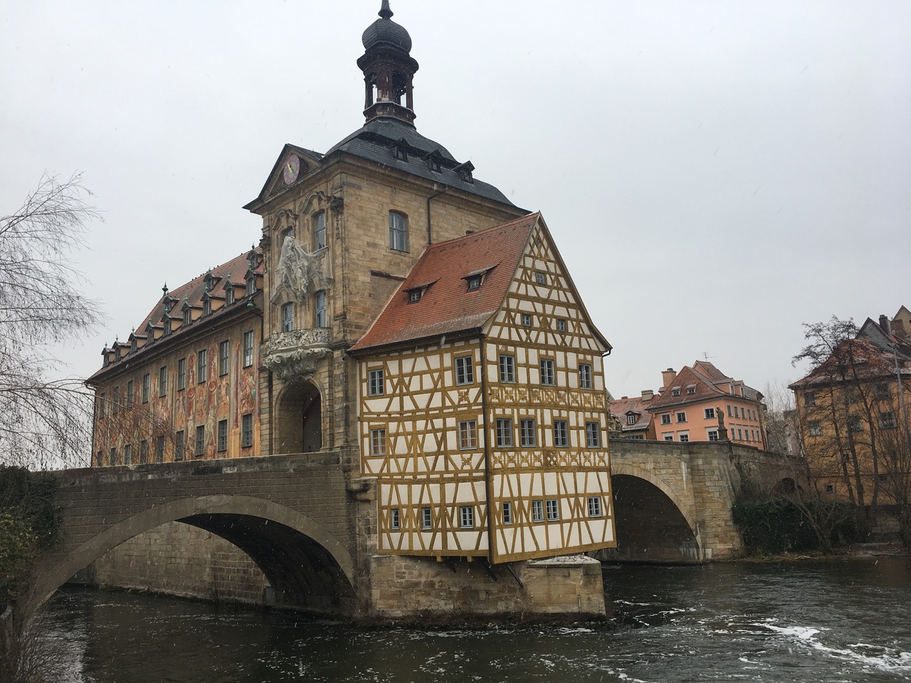 バンベルク駅から徒歩で旧市街に向かって歩くとはじめに見えてきます。石橋をまたぐように建っていて、下の川では真冬ですがカヌーを悲しむ人がいました。1つ隣の橋の上が写真スポットで、たくさんの観光客が写真を撮っています。