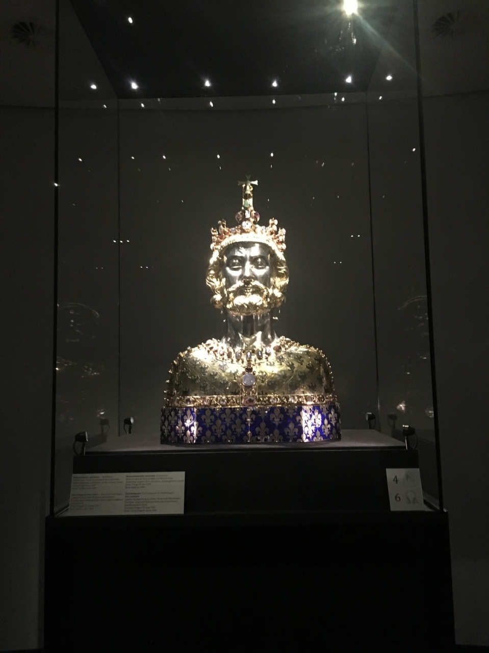 大聖堂に併設とか隣接という情報をネットで見ましたが、宝物館までは一回大聖堂の入り口を出て、数分歩きました。私はツーリストインフォメーションでチケットを購入してから向かいました。宝物館の入り口で大きな荷物はコインロッカーに預けるよう言われます。ここはカール大帝の胸像が有名です。