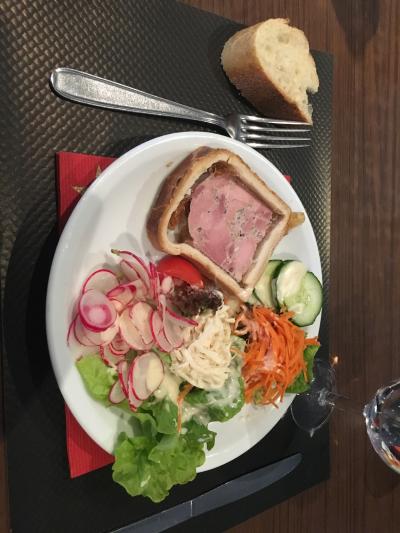13:30予約でしたが、席の用意ができるまでしばらく外で待機しました。100人くらいの大所帯だったため、二階の団体客用スペースに案内されました。席が足りなくて、即席で席をセッティングしてもらいました。ツアーの食事はベジタリアンがキッシュ、ノンベジタリアンが豚料理だったので豚肉を選択。まあまあでした。